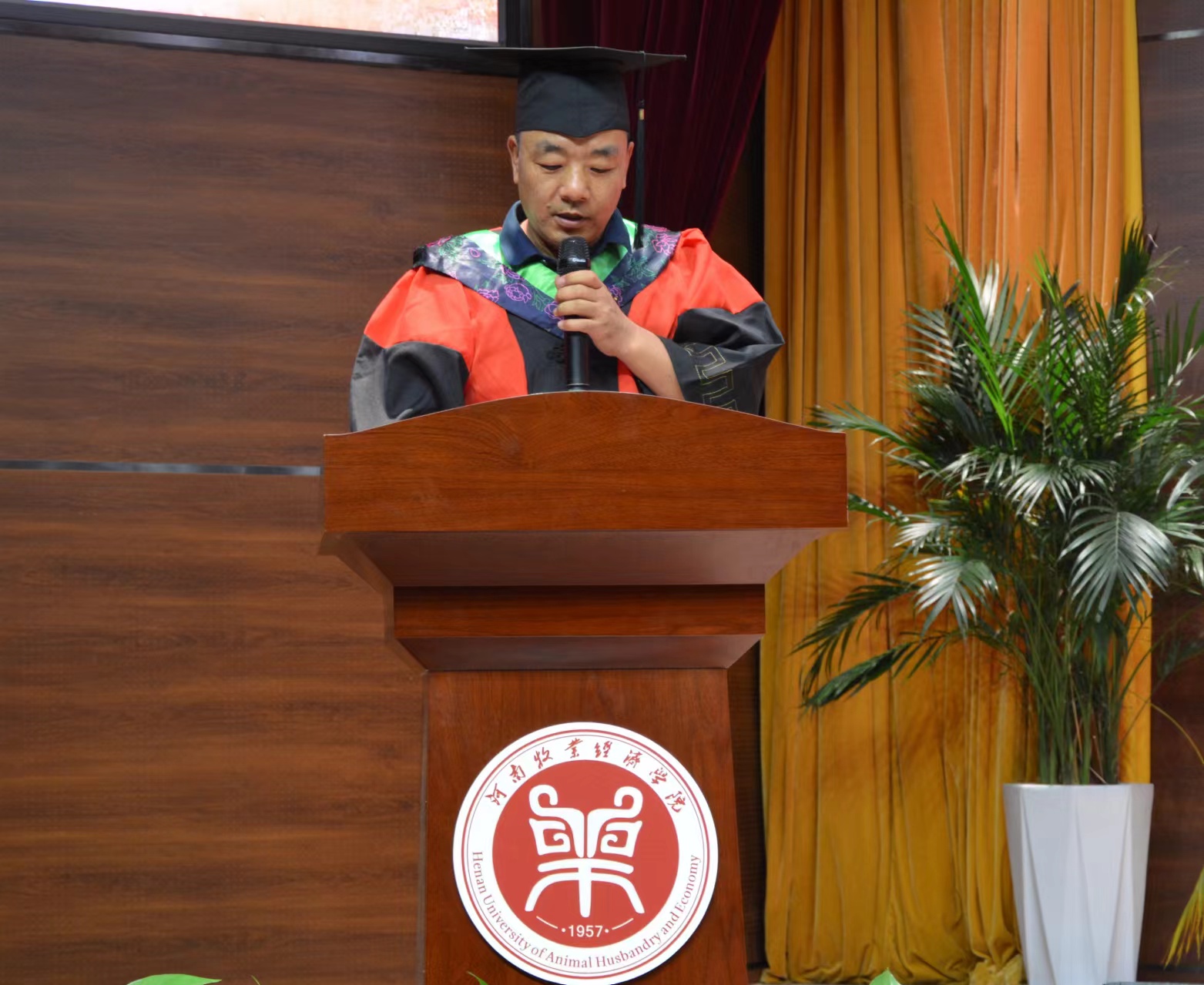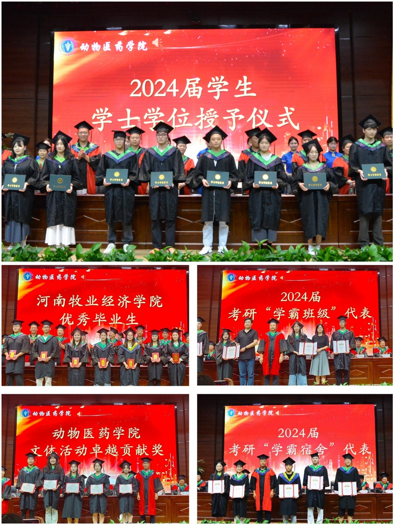 典礼在庄严的国歌声中拉开序幕。动物医药学院副院长汤法银宣读了《关于授予王亚帆等761名同学学士学位的决定》,台上10位导师依次为获得学士学位的同学扶正流苏,颁发学士学位证书。动物医药学院党委书记胡卫东宣读了河南省优秀毕业生、pg电子官方网站优秀毕业生、全国第七届动物医学专业技能大赛特等奖、全国第八届“雏鹰杯”动物医师技能大赛团体一等奖、学院文体活动卓越贡献者、学院优秀学生干部、学霸宿舍及学霸班级获奖名单,与会领导依次为获奖学生和班级颁奖。