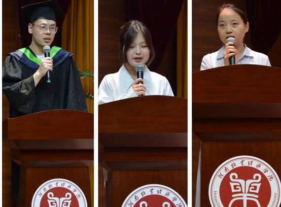 学院毕业生代表王渤言、在校生代表高少、教师代表朱丽飞博士分别发言,表达了对学校领导、老师的感恩和毕业季的依依惜别之情。