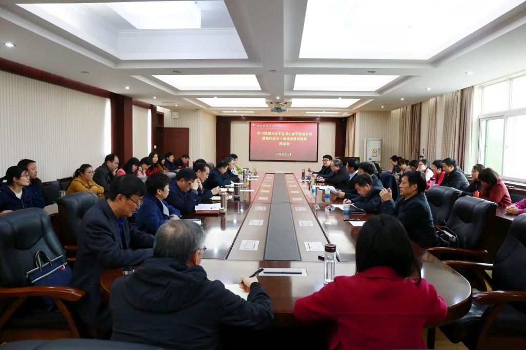 下午,学校在英才校区行政楼五楼会议室召开学习贯彻习近平总书记在学校思想政治理论课教师座谈会上的重要讲话精神座谈会。座谈会邀请了参加中央座谈会的河南省教师代表、漯河食品职业学院党委副书记程东阳教授和pg电子官网特聘思想政治理论课卓越教师、郑州大学程明欣教授参加。校领导穆瑞杰、罗士喜、李绍文、许圣道出席会议,党政办、宣传部、教务处、马克思主义学院负责人以及思想政治理论课专兼职教师共40余人参加座谈会。会议由校党委副书记、工会主席李绍文主持。