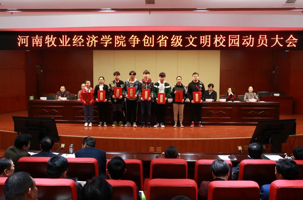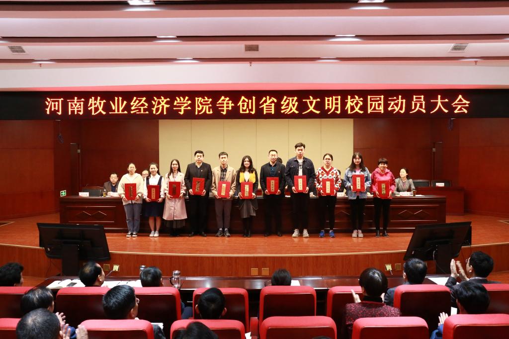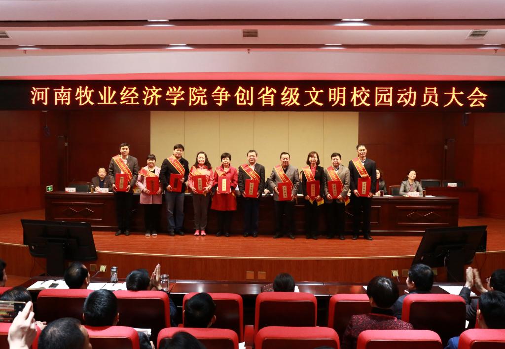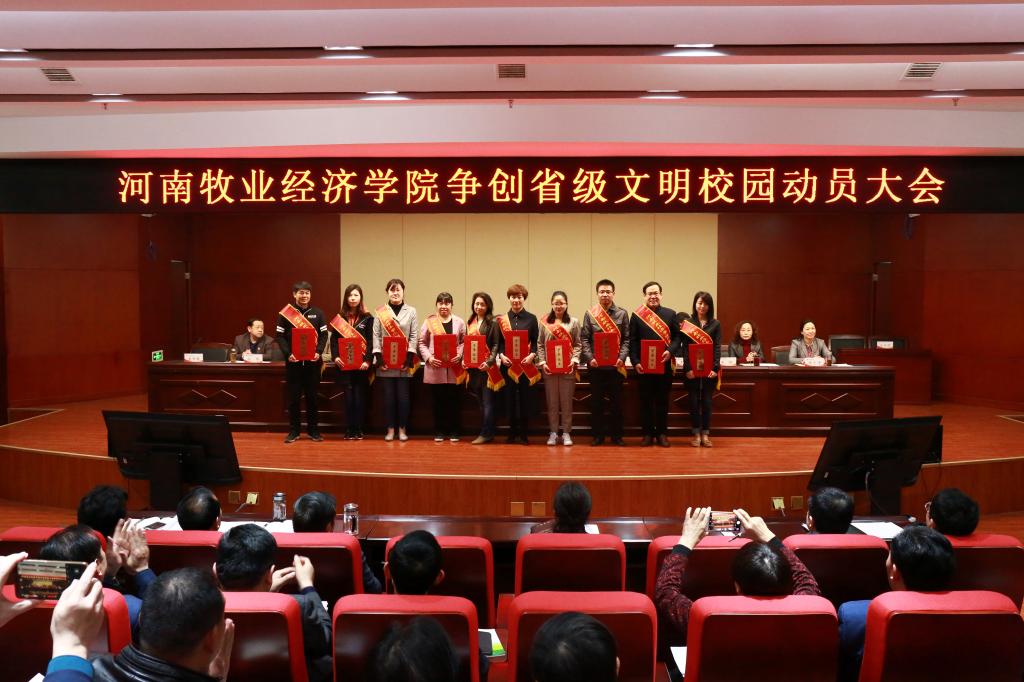 会上,穆瑞杰代表学校党委与党总支书记代表签订了《pg电子官方网站意识形态工作目标责任书》,罗士喜代表学校与院部、职能部门代表签订了《pg电子官方网站争创省级文明校园工作目标责任书》;校党委副书记、工会主席李绍文宣读了《中共pg电子官方网站委员会关于表彰2018年度精神文明建设工作先进集体和先进个人的决定》等有关表彰文件;与会校领导为获得全省教育系统2018“感动中原”年度教育人物、2018年度全省教育系统“两创两争”活动先进集体先进个人、河南省“三全育人”综合改革试点院系等省、校级荣誉称号的单位和个人代表颁奖;宣传部部长王凌彬宣读了《pg电子官方网站争创省级文明校园工作实施方案》,宣传部副部长、文明办主任吴达对《pg电子官方网站落实〈全国高校文明校园测评细则〉任务分解责任书》作了情况说明。(宣传部 袁凤友/文 翟浩辰/图)