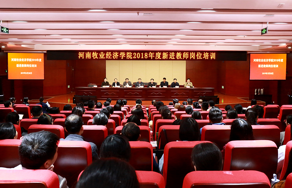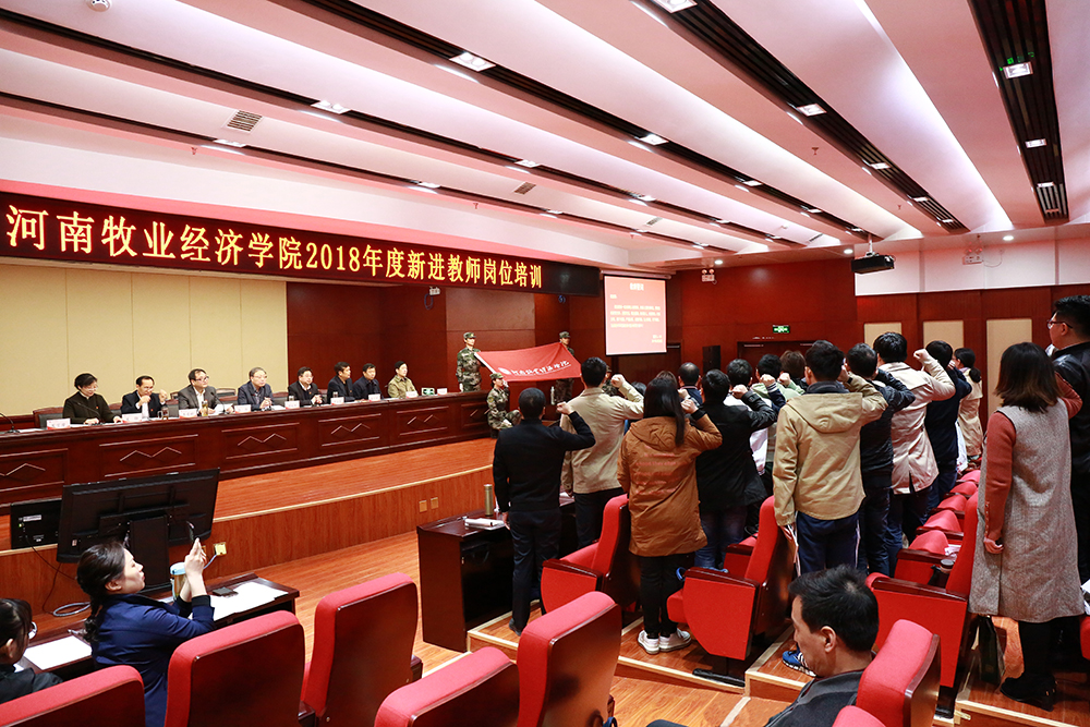 开班仪式上,校领导与相关部门负责人共同为新进教师佩戴校徽;新进教师在参会领导的共同见证下,面对校旗庄严宣誓;教师代表、河南省优秀教师赵辉做了发言。