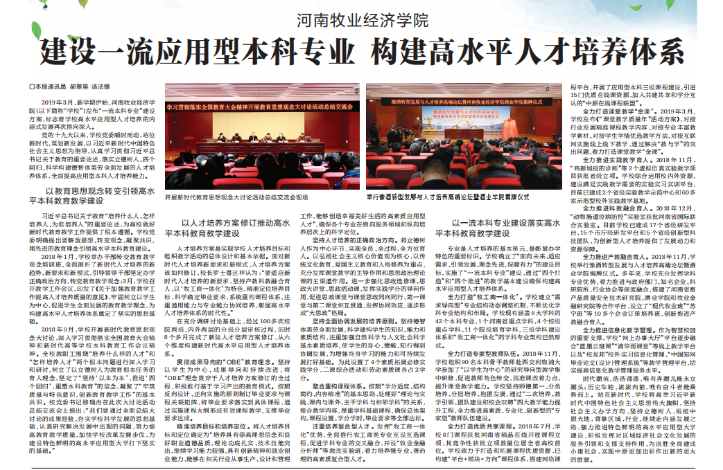4月29日,《河南日报》以《建设一流应用型本科专业构建高水平人才培养体系》为题报道了pg电子官网认真学习贯彻习近平总书记关于教育的重要论述,落实立德树人、四个回归,科学构建德智体美劳全面发展的人才培养体系,全面提高应用型本科人才培养能力的相关情况(相关链接http://newpaper.dahe.cn/hnrb/html/2019-04/29/content_335891.htm)。