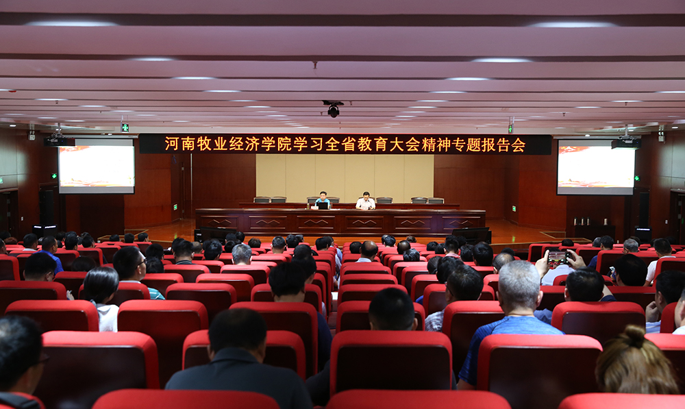 罗士喜首先指出,全省教育大会是省委省政府在我省全面建设小康社会进入关键时期召开的一次十分重要的会议。大会明确了河南教育的现状问题和目标思路,明确了推进我省教育现代化的四项根本要求、立德树人加快教育现代化的三项举措、加快我省教育现代化的五个着力点、河南高等教育的四个努力方向和加快河南教育现代化的四项重要保障,吹响了加快教育现代化、建设教育强省的号角,在我省教育发展史上具有里程碑意义。之后,他从教育的重要战略地位作用、新时代教育改革发展的总体思路、新时代教育的基本方针、教育的根本任务以及立德树人的重要举措等五个方面对全国及我省教育大会精神进行了深刻解读,并就加快pg电子官网高水平应用型大学建设提出五点具体要求。一是要学习领会教育新思想,做到入脑、入心、力行;二是要围绕“牧工商一体化”强化特色培育、内涵提升;三是要对接产业、服务行业优化学科专业建设;四是要完善人才培养模式,把立德树人要求贯穿全过程;五是要加强党的领导,强化办学保障。