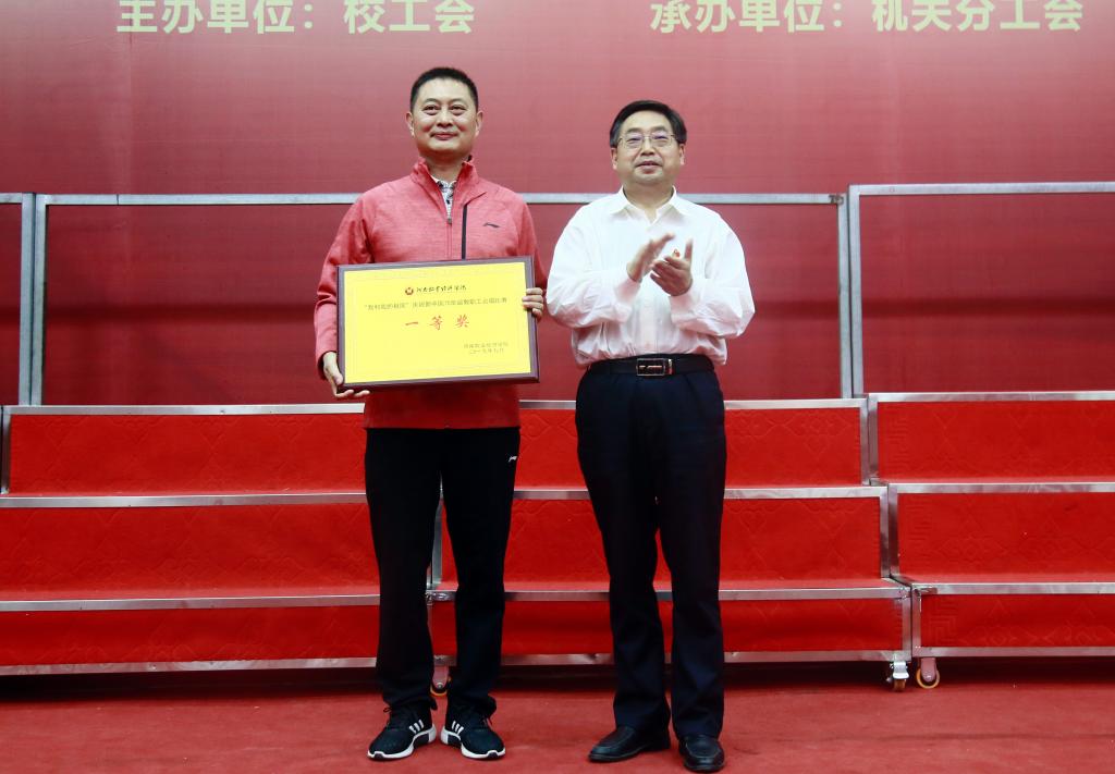 27支代表队经过紧张激烈的比赛,信息工程学院(软件学院)分工会、艺术学院分工会荣获一等奖,外国语学院分工会、离退休职工工作处分工会荣获二等奖,动物医药学院分工会、动物科技学院分工会、金融与会计学院分工会、国际教育学院分工会荣获三等奖,食品与生物工程学院分工会、经济与贸易学院、能源与智能工程学院分工会、文法学院荣获优秀组织奖。与会领导为获奖代表颁奖并合影留念。