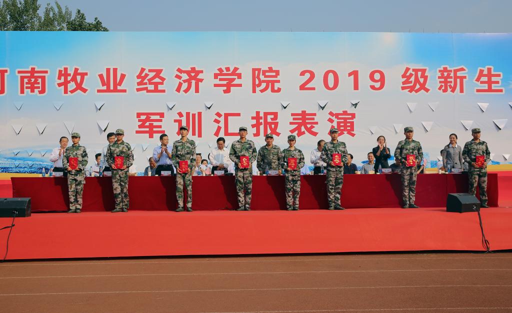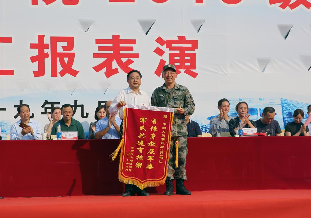 大会上,校长罗士喜为承训部队赠送锦旗。校党委副书记李波、副校长张卫宪分别在两校区宣读《关于表彰2019级新生军训方阵和先进个人的决定》,授予2019包装工程02方阵等44个方阵“2019级新生军训先进方阵”荣誉称号,授予高玉辉等514名同学“2019级新生军训先进个人”荣誉称号,部队军官和校领导为军训先进方阵和先进个人代表颁奖。新生代表工商管理学院白宇、食品与生物工程学院张潇洒同学进行了发言。此外,校长罗士喜代表学校,向为军训工作付出辛劳的教官和老师们表示衷心的感谢,向刻苦训练的全体同学们表示亲切的慰问,向在军训中涌现出来的先进集体和先进个人表示热烈的祝贺。罗校长向即将开启大学生活的新生们提出几点希望:一是希望同学们继续弘扬军训中传承的爱国奋斗精神,进一步坚定理想信念,树立远大理想,涵养家国情怀;二是希望同学们继续发扬军训中养成的特别能吃苦、特别能战斗的精神,勤学敏思、脚踏实地,求得真学问、炼得真本领;三是希望同学们继续保持军训中养成的良好生活习惯,坚持“天天锻炼、健康成长、终身受益”的目标,热爱生活,与人为善。罗校长讲:“同学们,我们即将迎来中华人民共和国建国70周年华诞。让我们带着举国同庆的喜悦,让我们保持和发扬军训养成的良好作风,牢记使命,砥砺前行,不负韶华,争做新时代优秀青年,在实现中华民族伟大复兴的中国梦进程中书写无愧时代的青春之歌和精彩人生!”罗校长饱含深情的讲话,使同学们精神振奋,倍受鼓舞,现场响起了一阵又一阵热烈的掌声。