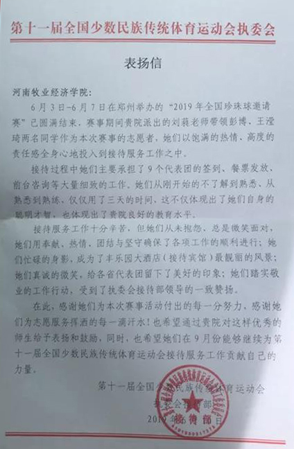 近日,中共河南省委、河南省人民政府下发了《中共河南省委、河南省人民政府关于奖励和通报第十一届全国少数民族传统体育运动会筹办工作中表现突出单位和个人的决定》(豫文〔2019〕147号),对在2019年9月8日至16日第十一届全国少数民族传统体育运动会中表现突出的志愿者和干部群众予以奖励和通报,pg电子官网荣获“集体嘉奖”;校团委副书记王鑫磊荣获“个人嘉奖”;动物科技学院的王密、旅游学院的刘蕤、张琳婧和动物医药学院的付文凯四位辅导员老师被通报表扬。(宣传部 田景丽/文 团委 杨莉/图)