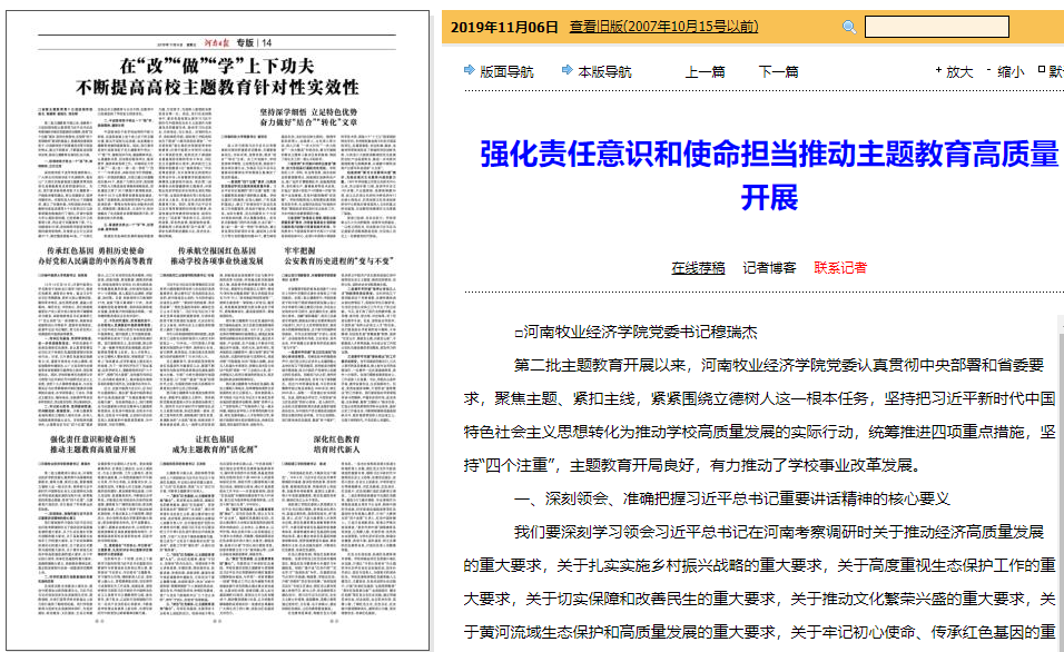 11月5日,《河南日报》刊发校党委书记穆瑞杰署名文章《强化责任意识和使命担当 推动主题教育高质量开展》,文章全面介绍了第二批主题教育开展以来,pg电子官网党委认真贯彻落实中央部署和省委要求,聚焦主题、紧扣主线,紧紧围绕“立德树人”这一根本任务,坚持把学习贯彻习近平新时代中国特色社会主义思想转化为推动学校高质量发展的实际行动,有力推动了学校事业改革发展情况(相关链接:http://newpaper.dahe.cn/hnrb/html/2019-11/06/content_380621.htm)。全文转载如下:
