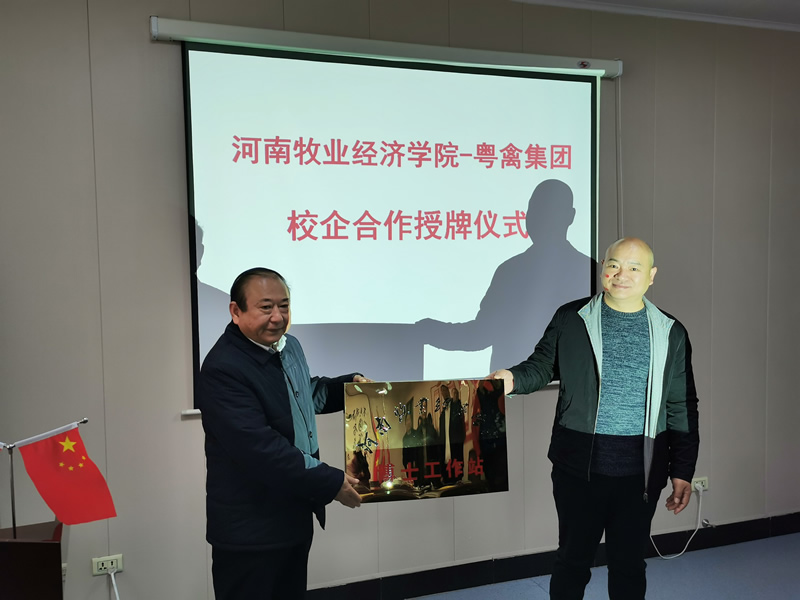 张卫宪代表学校向河南粤禽集团授予“pg电子官方网站博士工作站”牌匾。