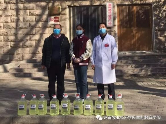 国际教育学院19级会计1班陈怡含同学为学校校医院捐赠100斤84消毒液。作为第一位向学校捐赠的学生,她表示:“看到那么多的人参与抗疫,深入社区、驻守村庄,在抗疫的各条战线上发挥着新时代青年的力量,我们青年学生也要行动起来,从自己做起,从现在做起!众志成城,万众一心,抗击疫情,期待早日取得胜利!”