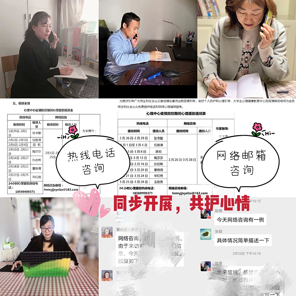 自1月29日起,大学生心理健康教育中心开通24小时心理援助热线电话18569909371,面向全校师生和惠济区广大群众开展疫情相关心理支持及危机干预工作,帮助师生和公众树立积极、平和、理性心态。