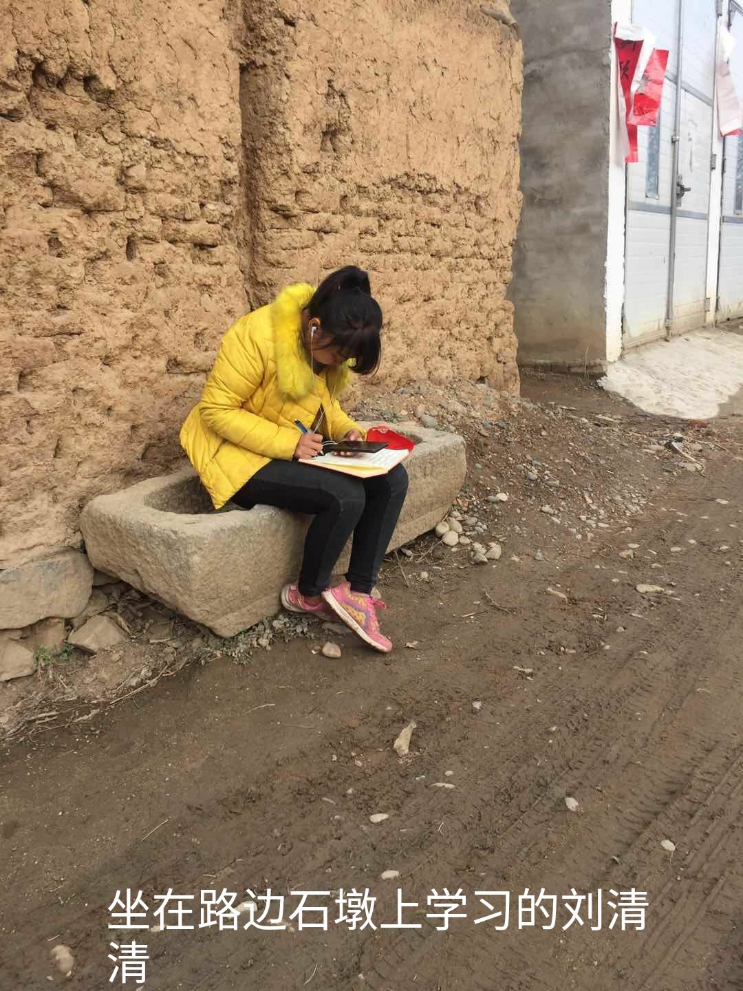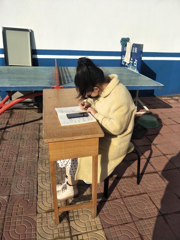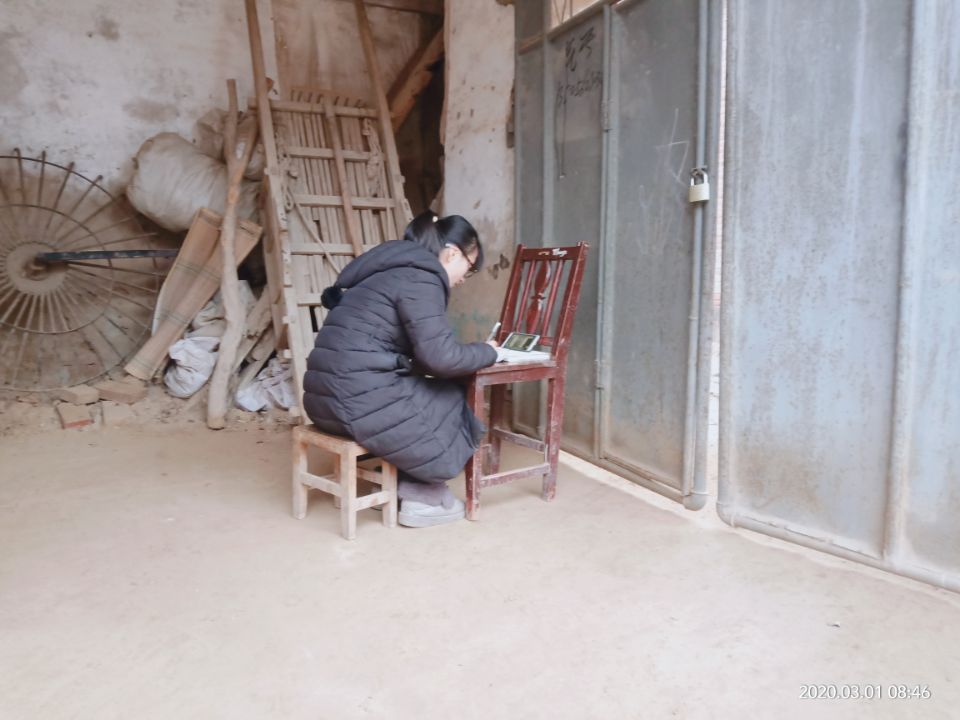 18商英02班的张蕊同学,因为家中未装宽带,手机流量又限速,为了能跟上学习进度,她在每天网络教学直播前就早早搬好凳子坐在自家大门后边,“蹭”邻居家的WiFi听课。春寒料峭,但冻得手脚冰凉的她乐观地认为:这些都不是困难,外在环境的恶劣无法成为她前进路上的绊脚石。