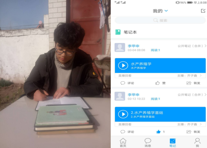 17动科饲料班李甲申同学为了保证网课学习顺畅,不畏天气严寒,将课桌搬出房间,每天坐在自家院子中,利用手机观看各科目的直播课程,认真做好课堂笔记,直播过程中遇到网络不稳定时,他会通过一遍遍地学习PPT,反复观看直播回放进行巩固学习。