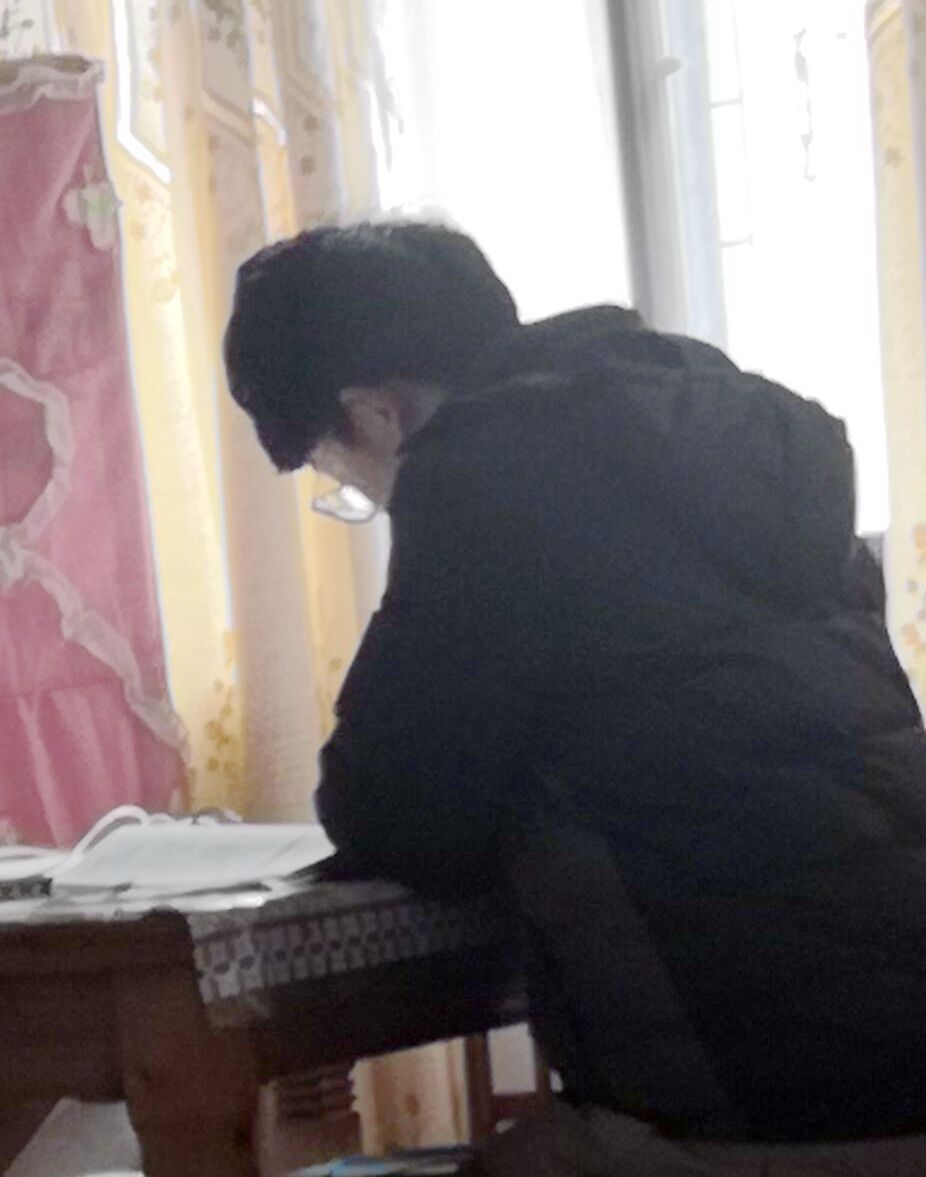 19统计01班郭佳琳同学家里网络出现问题,因疫情管控未能及时修复,便跟随父亲到父亲工作单位借助网络学习;因为没有课本,让同学们把课本拍下来发给自己,然后进行手抄学习内容,想方设法不落下一节课。