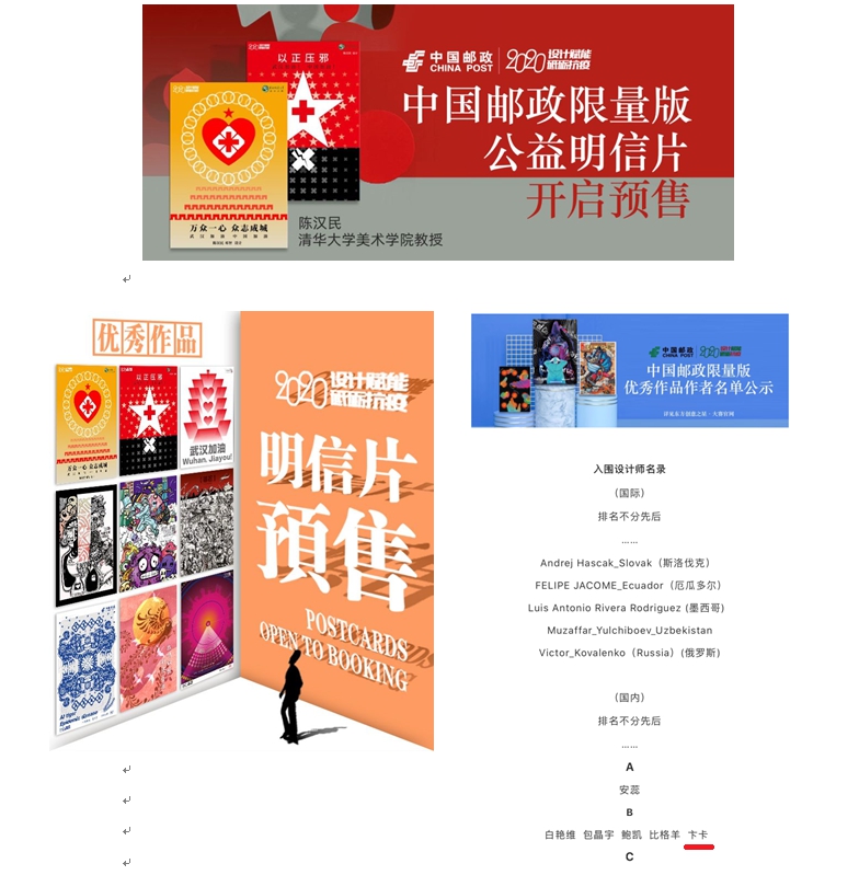 活动受到社会各界热情高涨的参与者踊跃投稿,大赛组委会共收到国内外两万多名设计师创作的近三万件作品,其中不乏设计界泰斗级大师陈汉民等前辈,也有众多享有盛誉的设计工作室和独立设计师的投稿。经过评审委员会专家审慎评选,433件优秀作品进入本次中国邮政定制版公益明信片作品库。pg电子官网艺术学院教师卞卡老师的作品有幸入库。