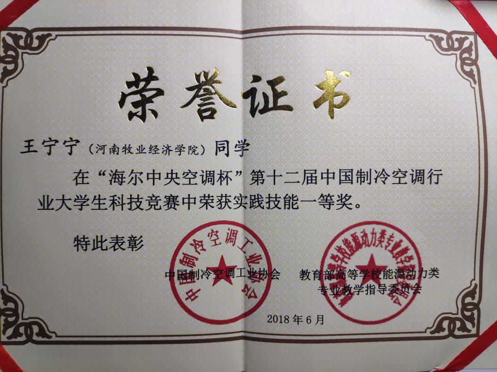 练就过硬本领。学所以益才也,砺所以致刃也。勤思好学,她一直保持谦虚和严谨的学习态度。在课堂上认真听讲,积极发言,勇于向老师提出疑问,并主动帮助同学解决学习上的难题。在校期间荣获2017—2018学年国家奖学金、省三好学生、校百名学业之星、校十大技能之星、校文明学生标兵之星。注重实践,利用课余时间,将课堂理论与实践相结合,培养自己的动手实践操作能力、创新意识及创造能力,先后跟随指导老师参加省级、国家级制冷空调行业大学生科技竞赛,凭借熟练技能操作、精彩的作品答辩以及扎实的理论知识,分别获得“海尔中央空调杯”第十二届中国制冷空调行业大学生科技竞赛实践技能一等奖、“海尔中央空调杯”第十二届中国制冷空调行业大学生科技竞赛团体二等奖;“第三届河南省大学生制冷空调科技竞赛”一等奖,共计奖金4200元。勤工俭学,星光不问赶路人。当大家都还在梦中酣睡,她已在赶往做兼职的路上;当大家在周末玩乐时,她却奔走在大街上为单位做宣传;当大家利用寒暑假旅游散心时,她埋头工作。一份份的兼职,挣够了基本生活费,也能给父母援手。