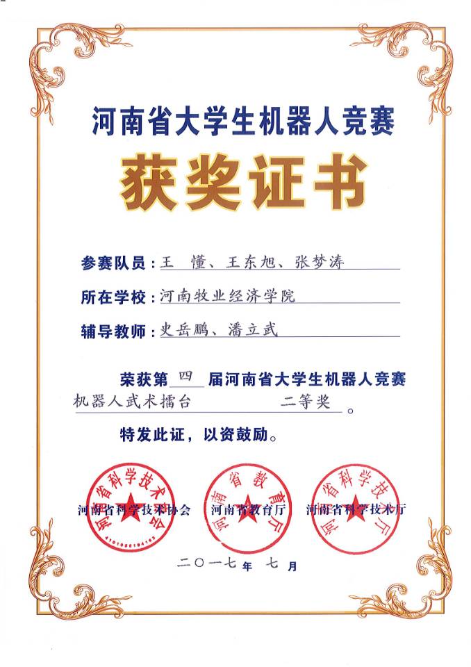 对人工智能有着浓厚兴趣的他,带领着院机器人实验室成员参加多个创新创业类比赛,取得硕果累累,如荣获省级2017年“挑战杯”大学生课外学术作品三等奖;在第四届河南省大学生机器人竞赛中,6个团队分别取得了二等奖三项和三等奖三项的优异成绩,在中国机器人大赛中取得三等奖两项的优异成绩,在今年第五届河南省大学生机器人竞赛中又取得了一等奖一项、二等奖一项和三等奖两项的优异成绩;正是前期的积累,正是他不断追求,始终坚定前行,也正因为他多次参加创新创业类比赛并获得多项荣誉,王懂同学两次获得校级“十大创新创业之星”单项奖。