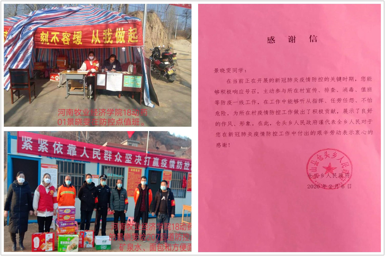 动物医药学院18级动药01班的景晓雯在疫情到来之时主动请战,迎着寒风冷雨,不惧疫情风险,逆行而上,以实际行动扛起了青年大学生的使命担当。不管在疫情防控值守点,还是物资捐赠和搬运现场,处处都能看到她的身影。鲁山县仓头乡人民政府对景晓雯同学在家乡疫情防控工作中的突出表现给予表彰和感谢。