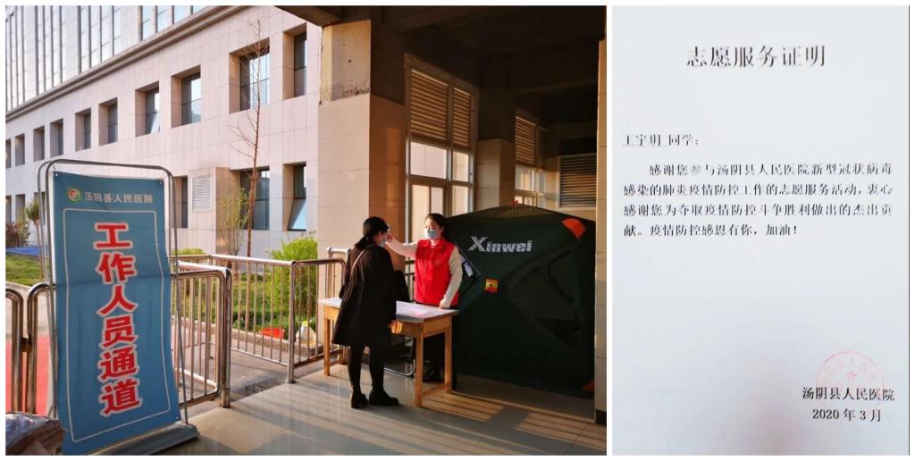 金融与会计学院19级保险01班王宇玥同学加入了安阳市汤阴县人民医院的志愿服务工作,她在医院门口进行体温检测,对出入人员进行信息登记,她尽心尽责守岗位,有序做好防疫工作,受到了汤阴县人民医院的表彰和感谢。