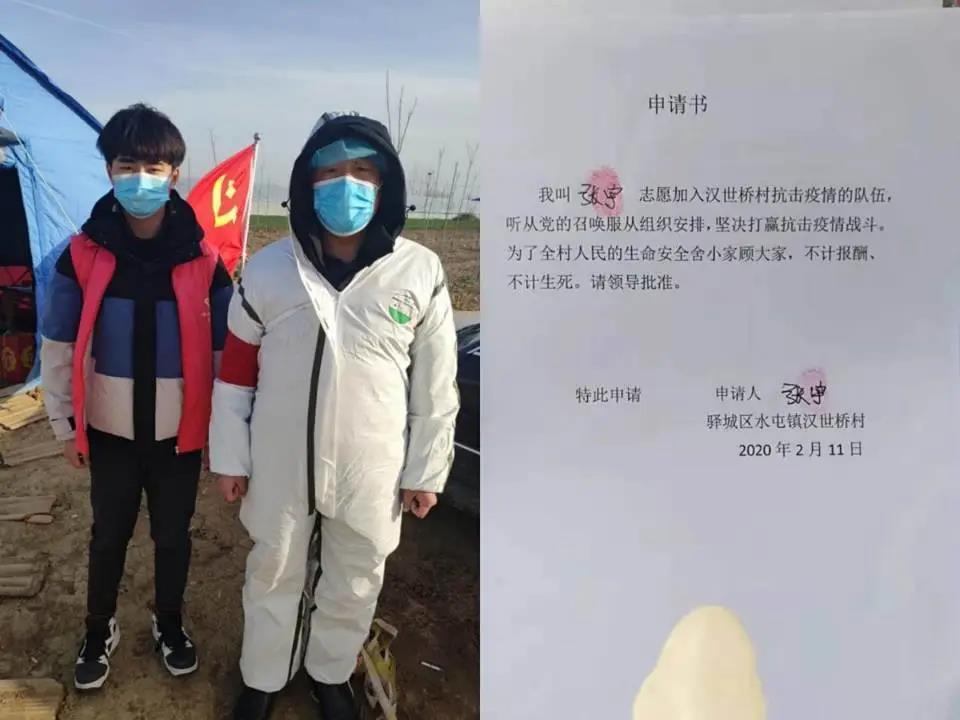 艺术学院18级环境设计03班张宇同学,第一时间向家乡所在地河南省驻马店市驿城区水屯镇汉石桥村疫情卡点处主动请战,成为一名光荣的志愿者。他每天和村里的党员干部以及其他青年志愿者24小时轮流值班,对来往村民开展疫情防控知识宣传工作,用实际行动保障着疫情期间家乡的安全。