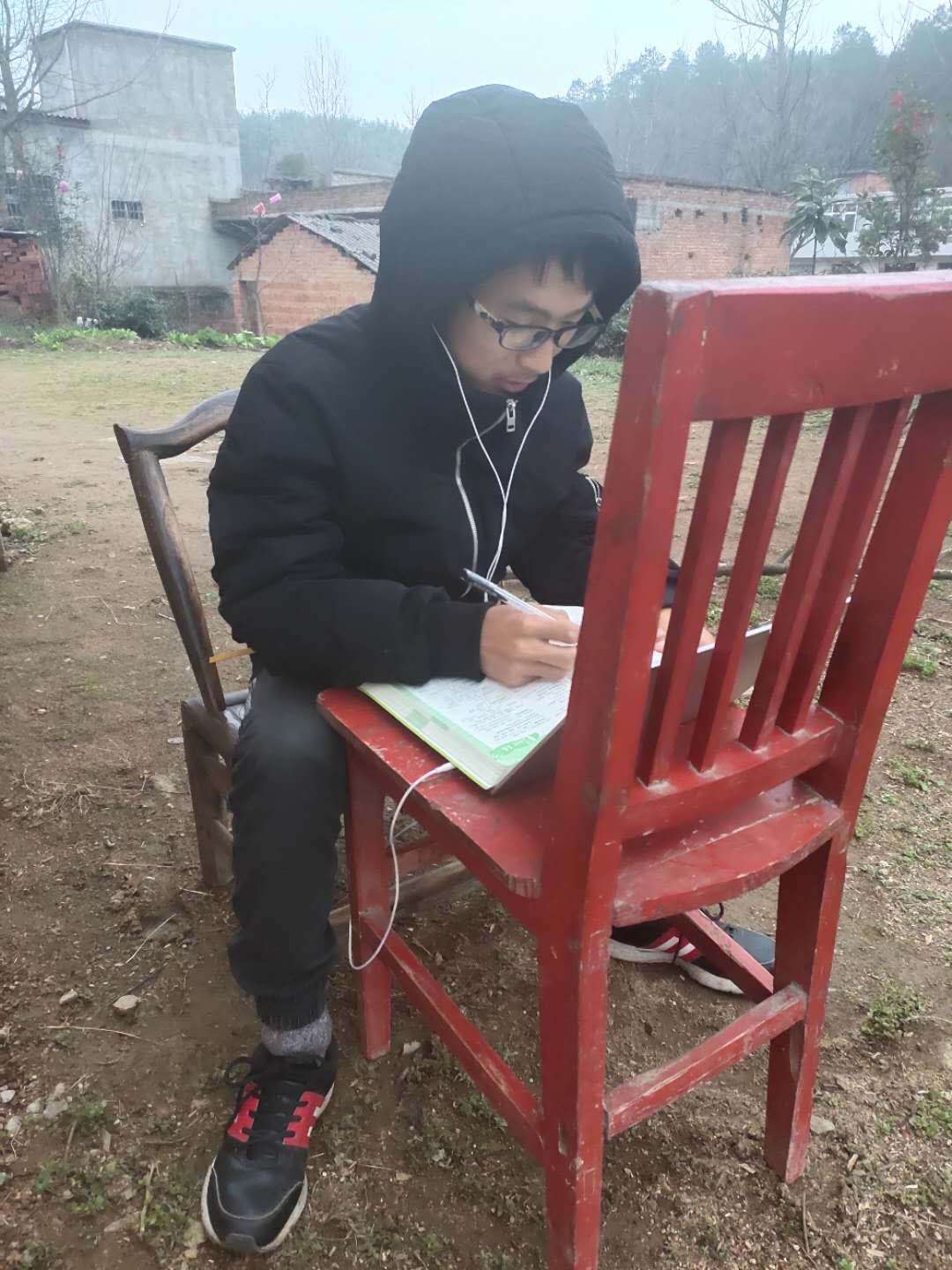 动物科技学院17级饲料班李甲申同学为了保证网课学习顺畅,不畏天气严寒,将课桌搬出房间,每天坐在自家院子中,利用手机观看各科目的直播课程,认真做好课堂笔记,直播过程中遇到网络不稳定时,他会通过一遍遍地学习PPT,反复观看直播回放巩固学习。