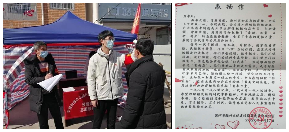 食品与生物工程学院16级酿酒01班唐孝天同学作为家乡党员防控突击队的一员,每天逐街逐巷进行宣传、排查,对各小区及背街小巷进行消毒,为防控卡点运送防疫物资,在防控卡点进行轮班值守,对出入居民进行信息登记、测量体温。他在家乡疫情防控工作中的突出表现受到了漯河市精神文明建设指导委员会办公室的高度赞扬。