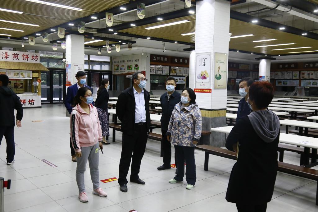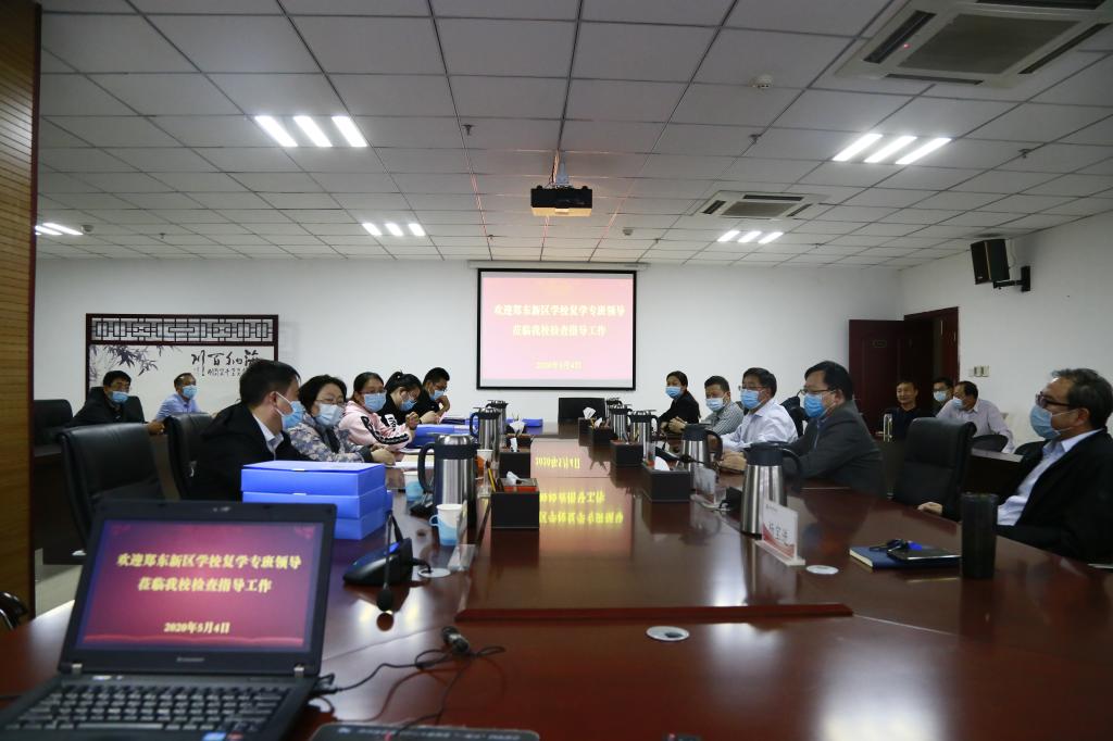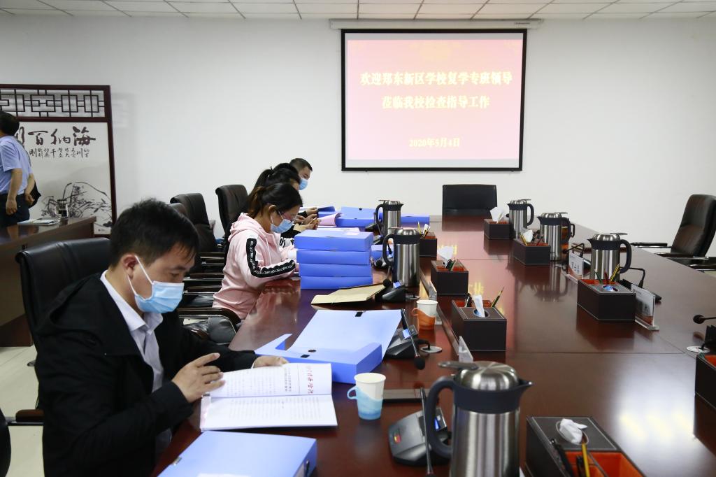 5月4日下午,由郑东新区教文体局麻玖玲一行6人组成的“五员专班”,到pg电子官网龙子湖校区督查返校复学准备工作,校长罗士喜,校党委副书记李俊杰、李波,副校长张伟、杨宝进和学校防控办各工作组负责同志陪同检查。