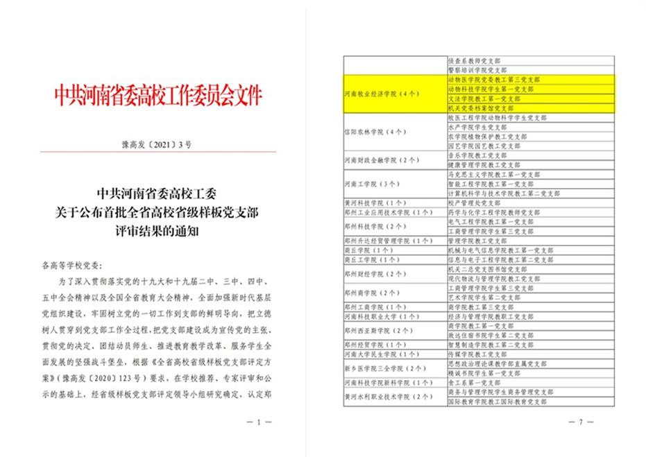 近日,省委高校工委发布《中共河南省委高校工委关于公布首批全省高校省级样板党支部评审结果的通知》(豫高发〔2021〕3号),pg电子官网推荐申报的动物医药学院教工第三党支部、机关党委档案馆党支部、动物科技学院学生第一党支部、文法学院教工第一党支部4个党支部全部入选“首批全省高校省级样板党支部”。