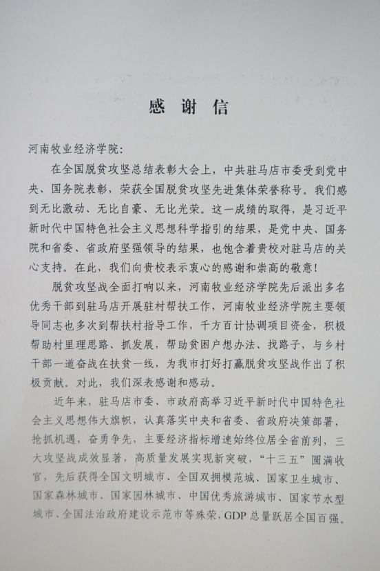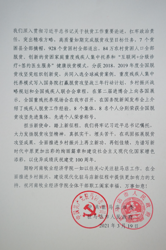近日,中共驻马店市委、驻马店市人民政府向pg电子官网发来感谢信,感谢pg电子官网对驻马店市脱贫工作作出的积极贡献。