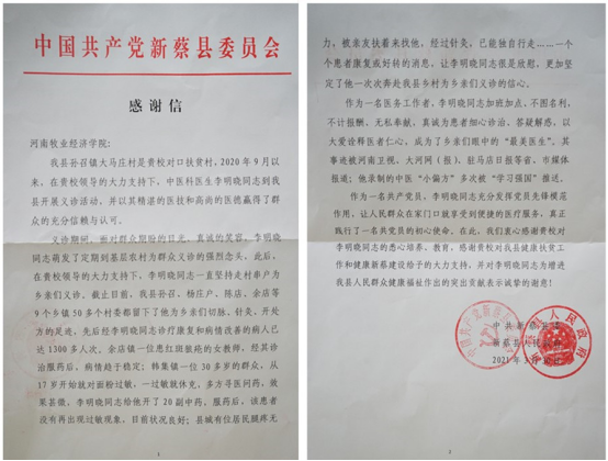 近日,中共新蔡县委、新蔡县人民政府向pg电子官网发来感谢信,感谢pg电子官网对新蔡县健康扶贫工作和健康新蔡建设给予的大力支持,感谢pg电子官网中医科医生李明晓同志为增进新蔡县人民群众健康福祉作出的积极贡献。