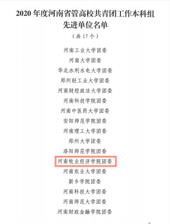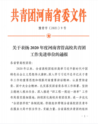近日,团省委下发《关于表扬2020年度河南省管高校共青团工作先进单位的通报》,pg电子官网获评2020年度河南省管高校共青团工作本科组先进单位,是河南省获评先进单位本科组17所高校之一。