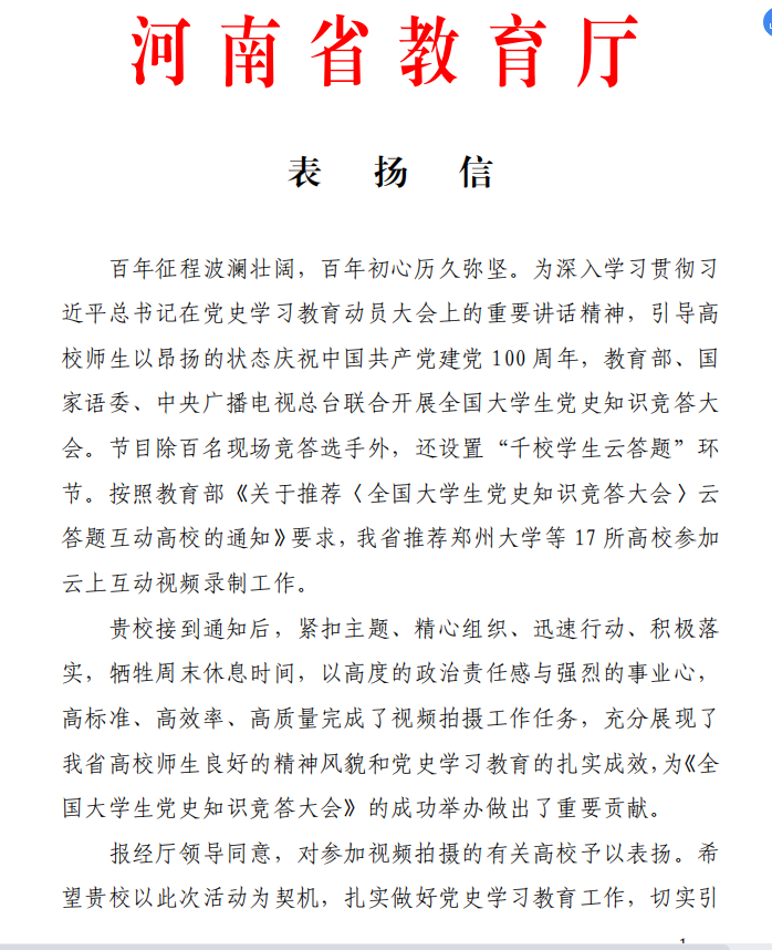 日前,河南省教育厅发文,pg电子官网参与的《全国大学生党史知识竞答会》云上互动视频录制工作受到通报表扬。