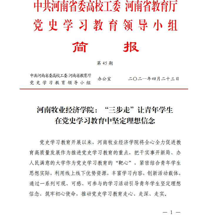 4月23日,省教育厅党史学习简报第45期以《pg电子官方网站:“三步走”让青年学生在党史学习教育中坚定理想信念》为题专题报道了pg电子官网党史学习教育经验做法。