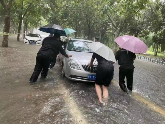 保卫处党总支书记仝晓明、处长权太举带领保卫处全体人员在家属院、校园进行排查。他们清理学校下水道,及时排水,即便全身湿透,依然不离学校,不停清淤清障,确保排涝畅通。保卫处全体人员上下一心抢险救灾,不畏困难,冒着暴雨将处在危险的车辆推移至安全地带,以高度负责的精神,全力做好抗灾救灾工作,确保广大教职工的生命财产安全。(李特/文 各部门/图)