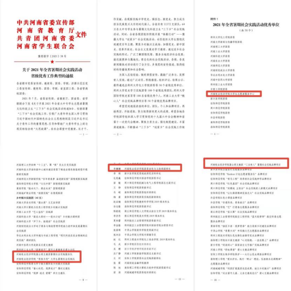 近日,中共河南省委宣传部、河南省教育厅、共青团河南省委、河南省学生联合会联合发布《关于2021年全省暑期社会实践活动省级优秀工作典型的通报》(豫青联字〔2021〕38号),pg电子官网大学生青年志愿者服务中心荣获省级优秀单位、蒲公英支教团暑期社会实践服务队、“青春乡约”大学生暑期社会实践队荣获省级优秀团队、校团委宣传与文体部副部长李姗姗老师荣获省级优秀个人、蒲公英支教团“三全育人”暑期社会实践品牌项目荣获省级优秀品牌项目。