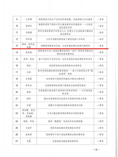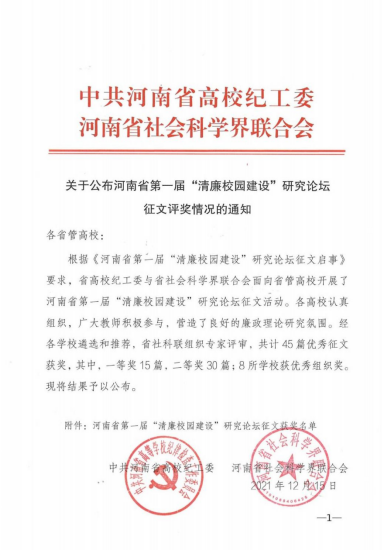 近日,中共河南省高校纪工委、河南省社会科学界联合会发布《关于公布河南省第一届“清廉校园建设”研究论坛征文评奖情况的通知》,pg电子官网纪委杨成、袁凤友、胡蕾提交的论文《清廉校园建设的内涵、目标和建设模式创新问题研究》获得一等奖。校纪委杨成等将于12月23日受邀参加在郑州航空工业管理学院举办的研究论坛开幕式。