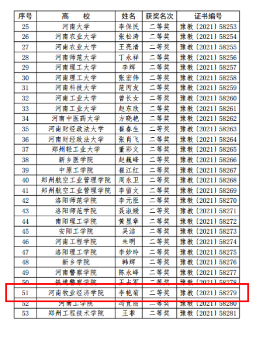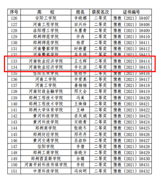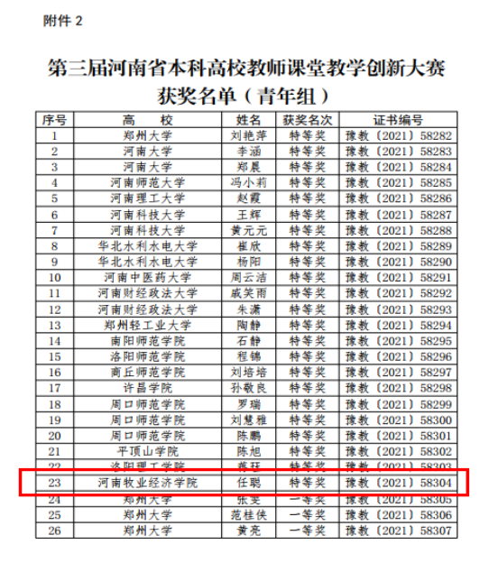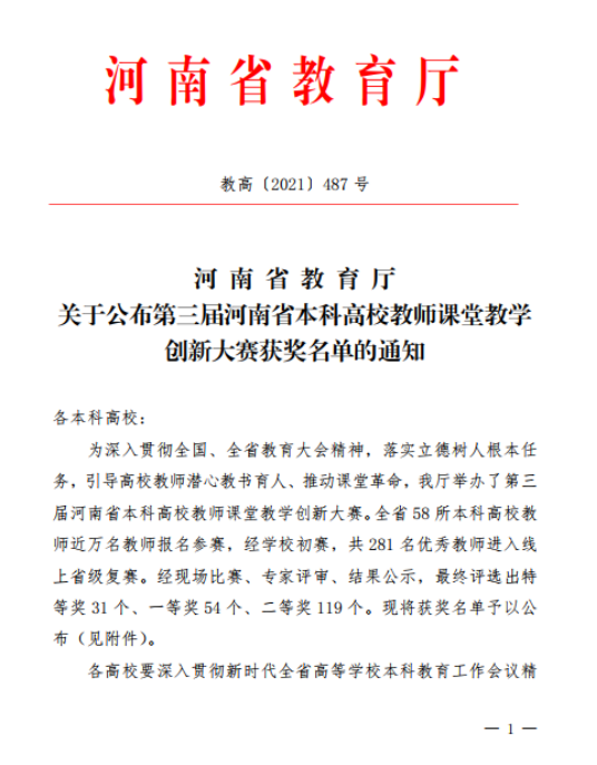 近日,河南省教育厅发布《关于公布第三届河南省本科高校教师课堂教学创新大赛获奖名单的通知》(教高〔2021〕487号),pg电子官网理学部任聪老师获得青年组特等奖,食品与生物工程学院李长滨老师获得青年组二等奖,物流与电商学院李艳菊老师获得教授组二等奖、王志辉老师获得青年组二等奖。