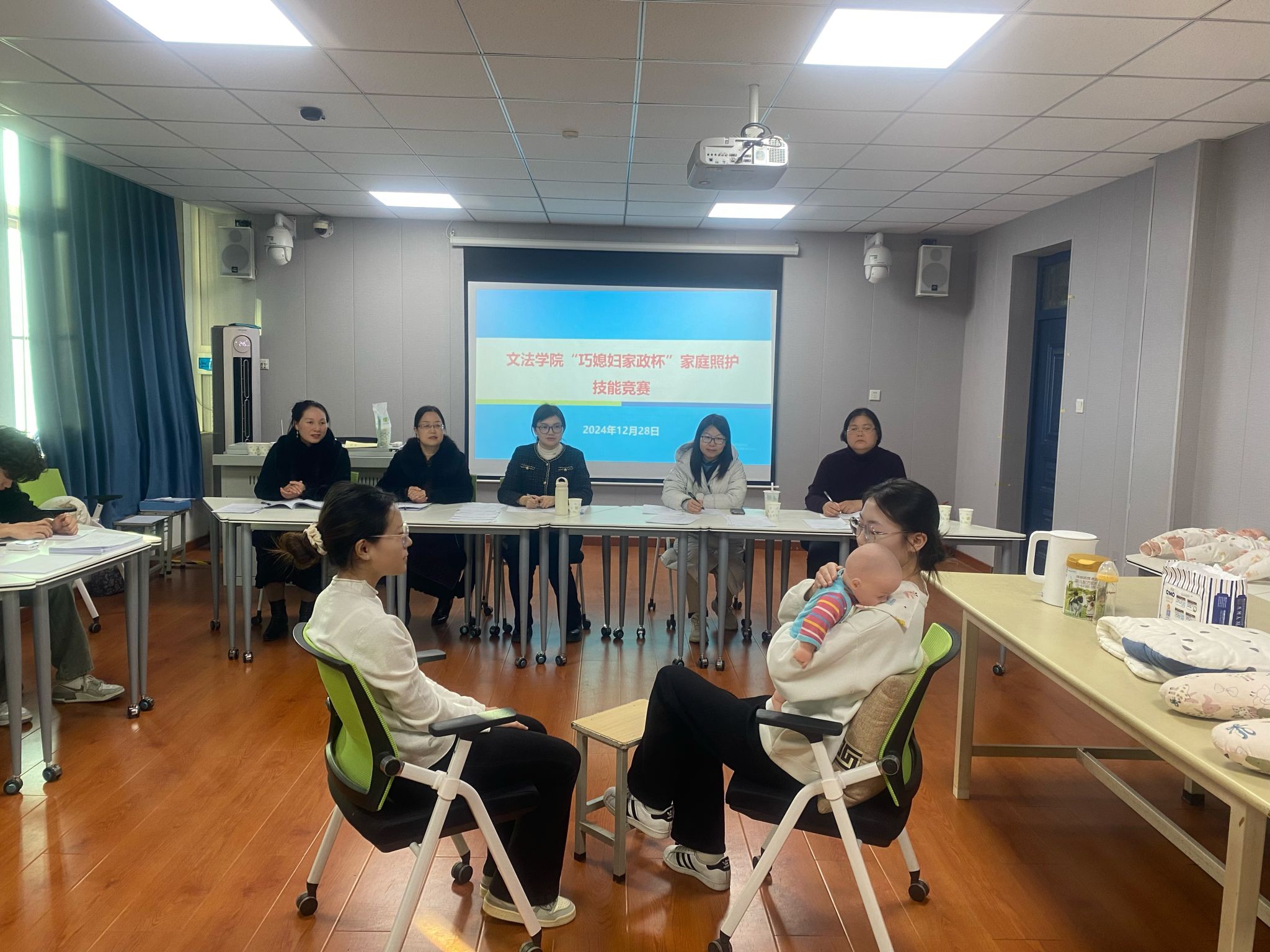 本次竞赛含婴幼儿照护、孕产妇照护、老年人照护三个项目,学生可以根据个人情况选择其中一个项目参赛。比赛参照家政服务员(母婴护理员、家庭照护员)国家职业技能标准进行考核,并适当增加新知识、新技术、新技能,校企双方共同担任比赛评委。赛前,文法学院积极动员,周密部署,专门安排教师对参赛学生展开悉心指导。备赛过程中,同学们认真学习理论知识,刻苦练习实操技能。赛中,同学们操作规范、沉着耐心,展现出了良好的家庭照护技能和扎实的专业素养,营造了 “比、学、赶、帮、超”的浓厚学风。